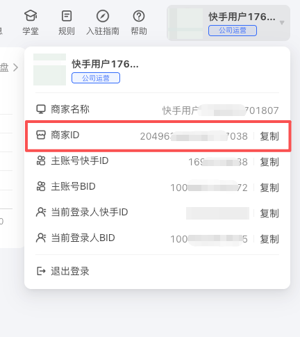① 在快手生活后台,鼠标点击右上角头像位置,会弹出账户信息,复制商家ID;