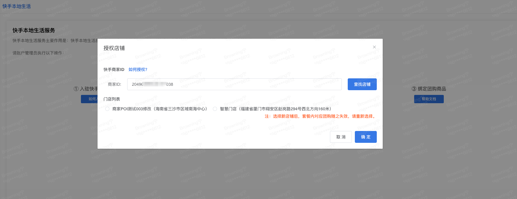 ③ 登录智慧门店后台网页端,进入 应用 - 快手本地生活,点击「已授权,绑定门店账号」,在弹出对话框中,填入刚复制的商家ID,并点击「确认」按钮;