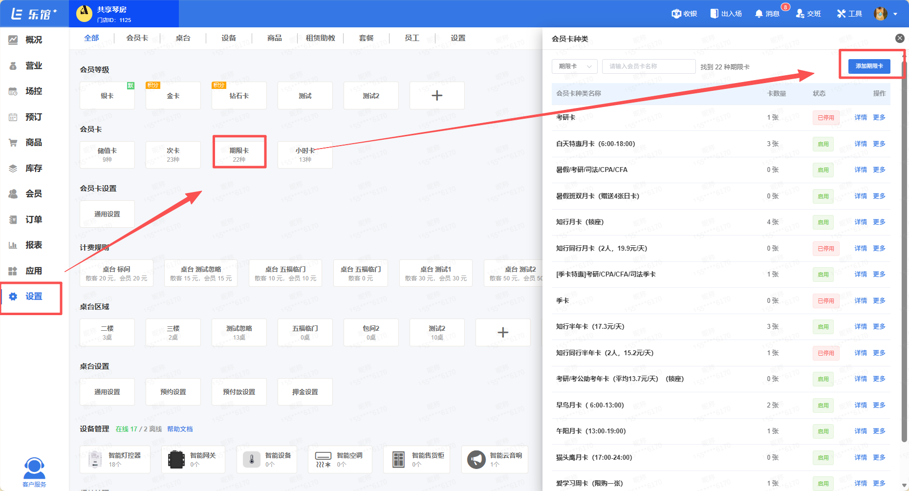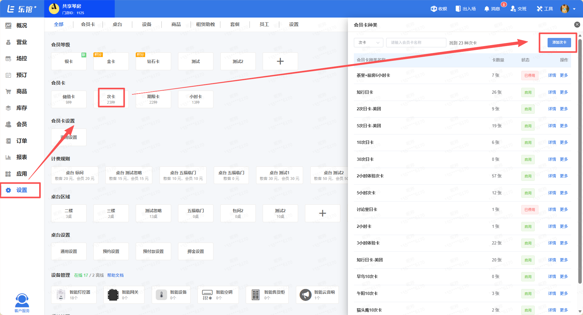 会员卡有四种类型,储值卡、次卡、期限卡、小时卡,添加会员卡时与添加计费区域一样,在开始设置之前,需要把系统默认演示数据删除,根据商家需求设置所需会员卡。