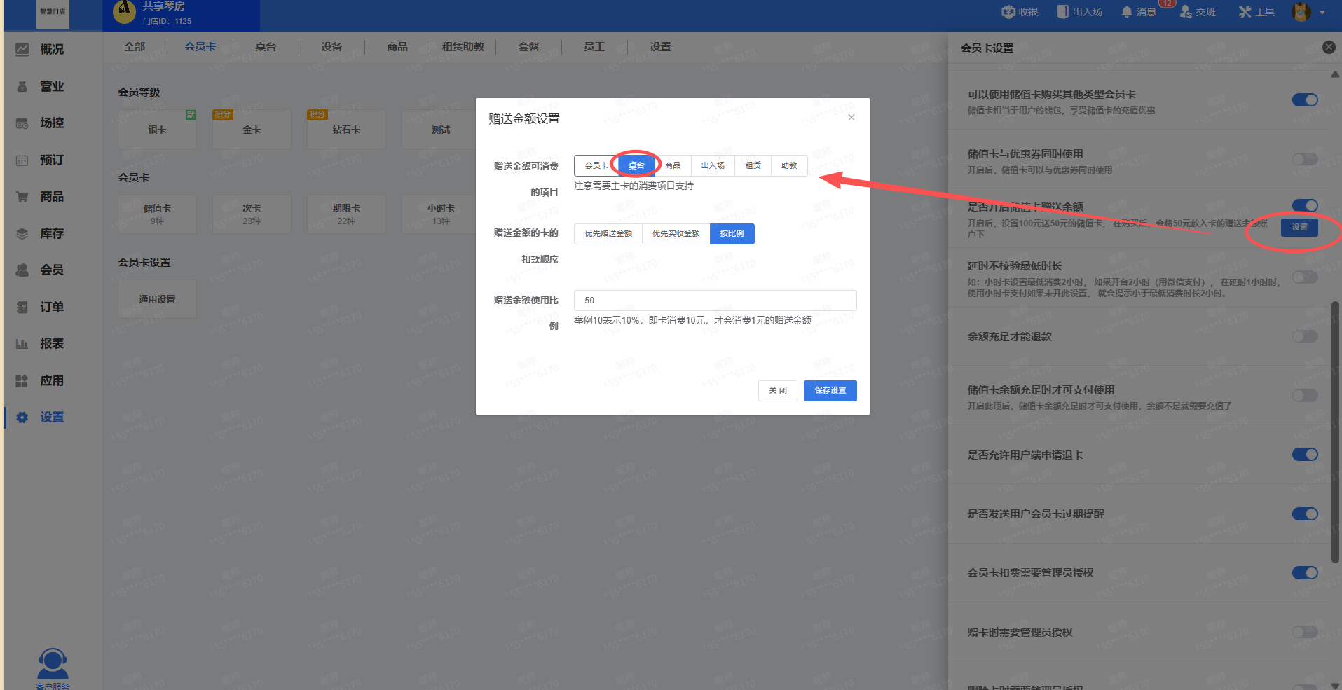 赠送金额可单独设置消费项目,如只允许消费桌台,不允洗消费商品,则按如下设置