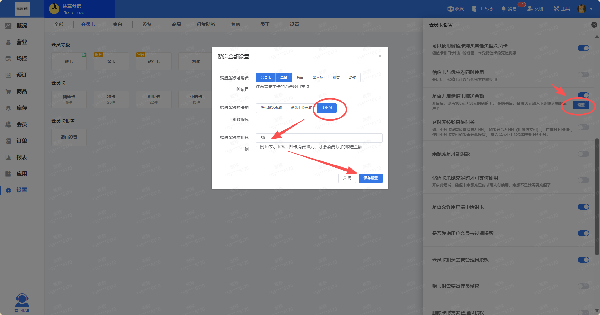 赠送金额想一次只允许使用50%,则选择按比例,填入50,即卡消费10元,才会消费5元的赠送金额,按照如下设置: